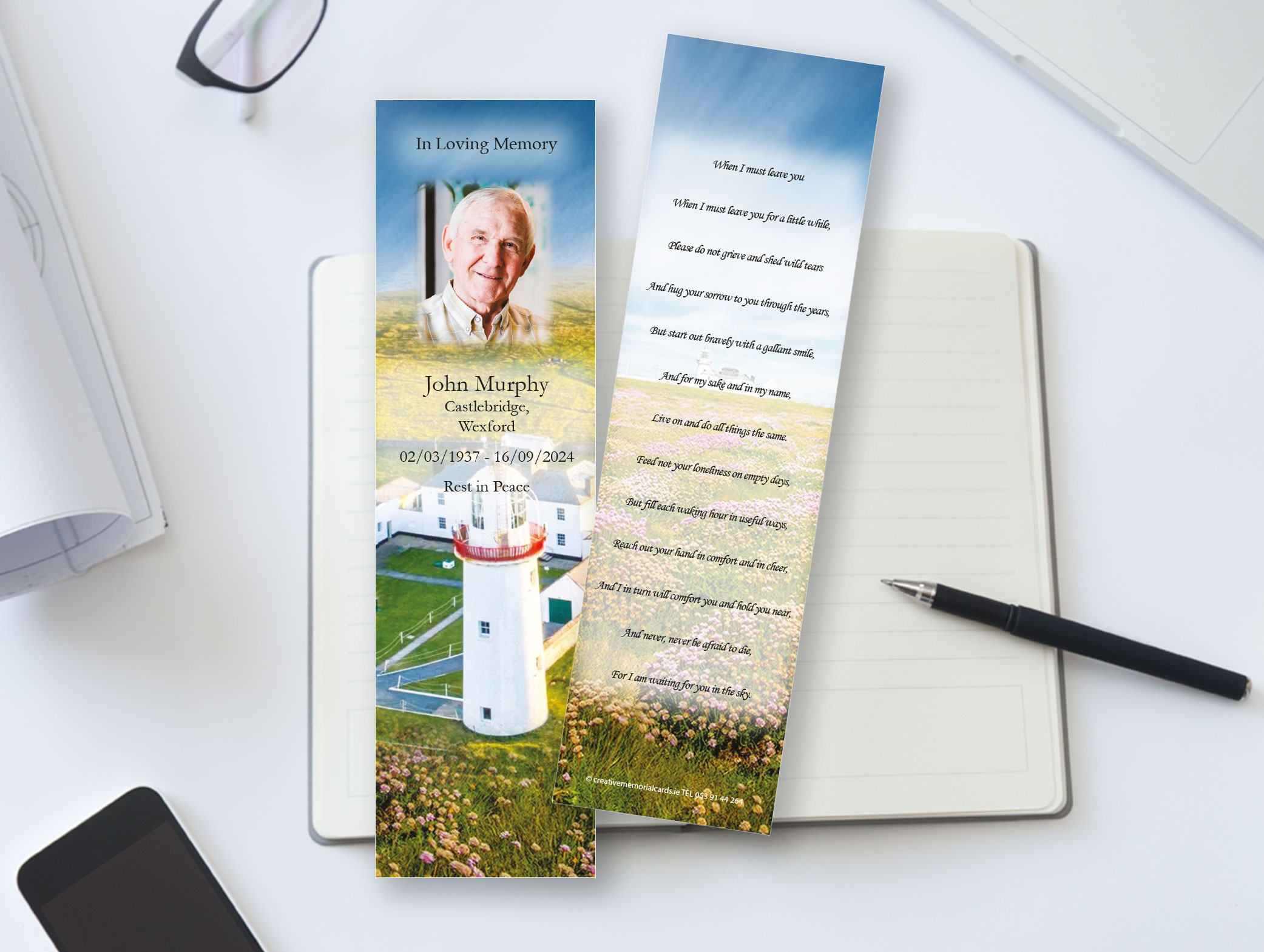 Alongside our Loophead Lighthouse memorial bookmarks, customers can choose any of our designs throughout our range of Wallet Cards, Bookmarks, and Acknowledgement Cards.