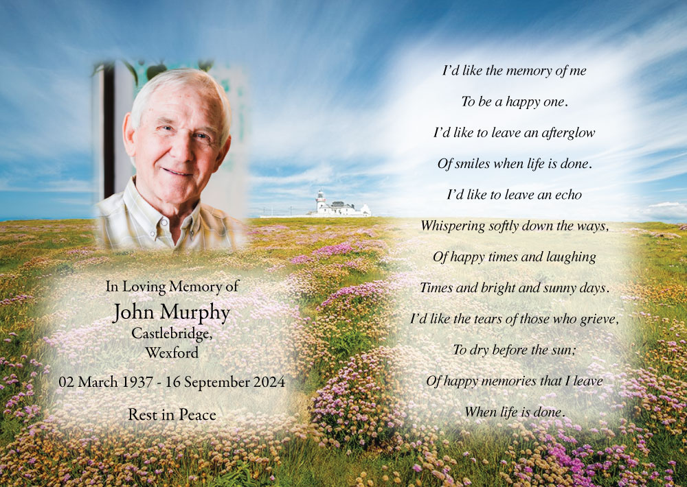 In addition to our Loophead Lighthouse Memorial Cards, we also offer a custom memorial card design service. Alternatively, you may wish to use your own images that have a special significance for your loved one. Click here to view our full range of Memorial Verses before you fill in the form.