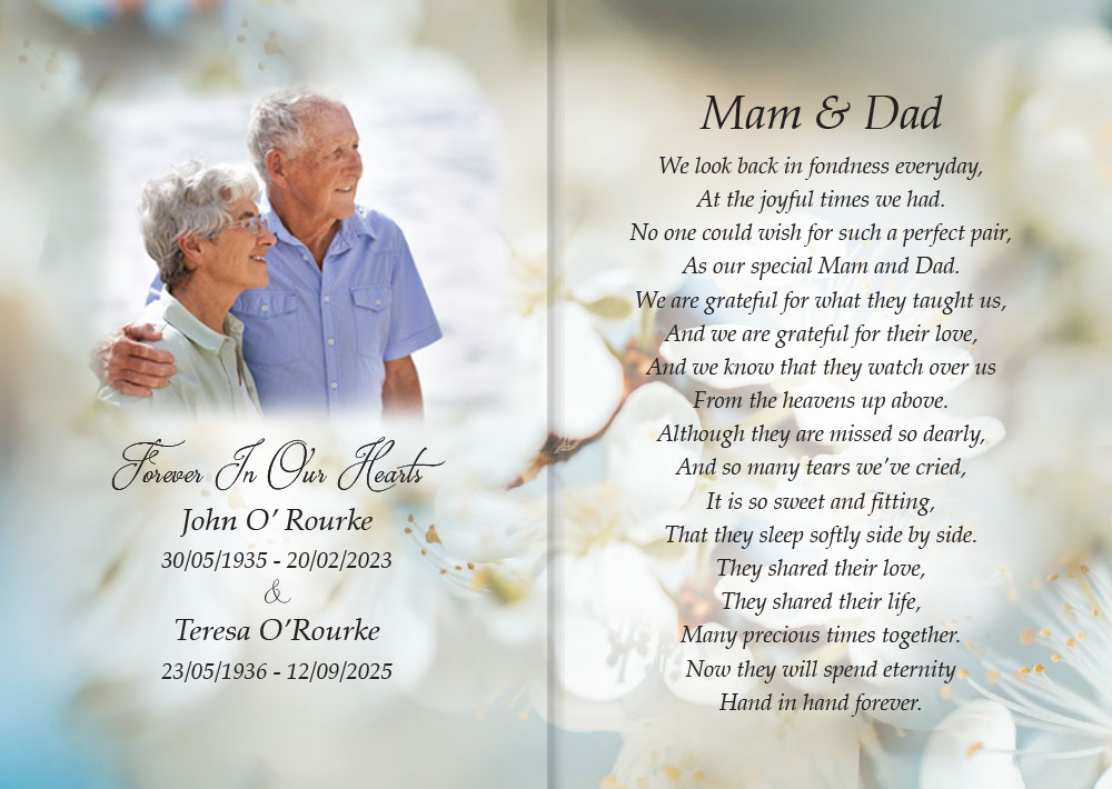 All memorial cards, come in the standard size format of 148mm wide x 105mm high, which, when folded, are 74mm x 105mm. We print on high-quality coated art board and finish with a high gloss laminate. When filling in our order form, please choose a cover title and add either a verse number from our collection or one of your own. Alternatively, you can provide your own verse or poem in the text box provided. In addition, you have the option to upload your own images and a photo of a loved one.