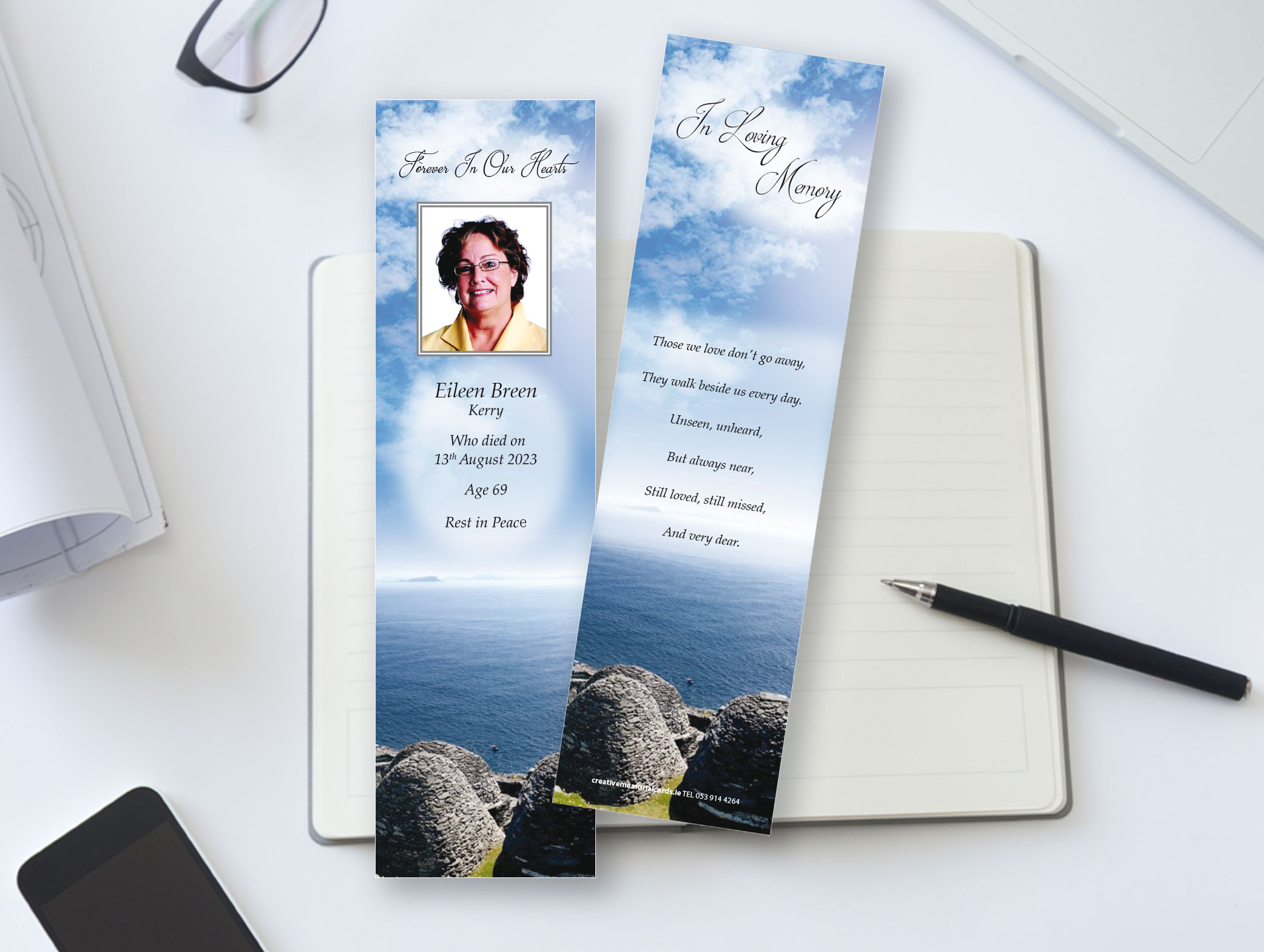 Alongside our Skellig Michael memorial bookmarks, customers can choose any of our designs throughout our range of Wallet Cards, Bookmarks, and Acknowledgement Cards.