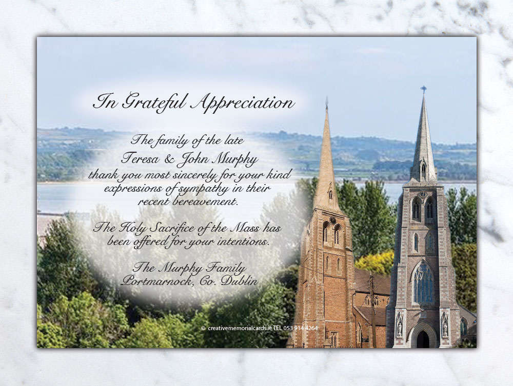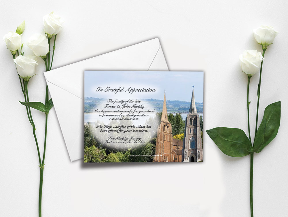 Creative Memorial Cards Ireland – Honour your loved ones with our beautifully crafted Wexford Twin Churches acknowledgement cards.