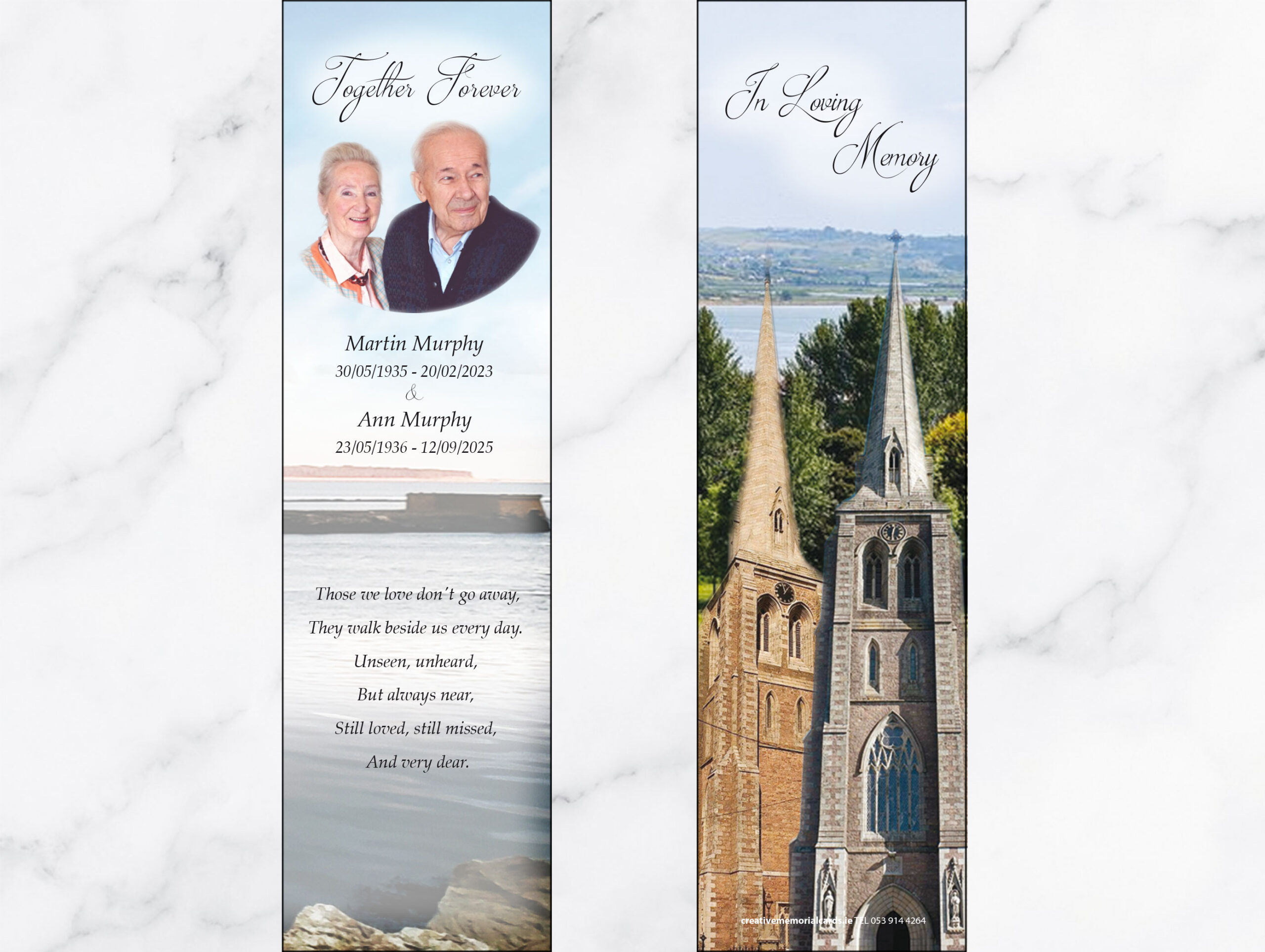 Our Wexford Twin Churches memorial bookmarks come in the standard size format of 55mm wide x 195mm high and fit neatly in envelopes, which come as standard. We print on high-quality coated art board and finish with a high gloss laminate. When filling in our order form, please choose a cover title and add either a verse number from our collection or one of your own. Alternatively, you can provide your own verse or poem in the text box provided. In addition, you have the option to upload your own images and a photo of a loved one.
